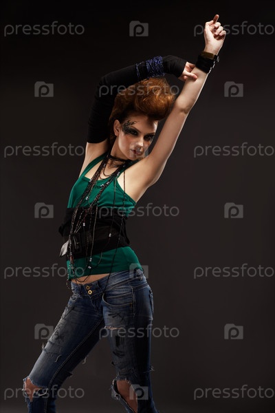 Портрет рыжей девушки-панка на сером фоне