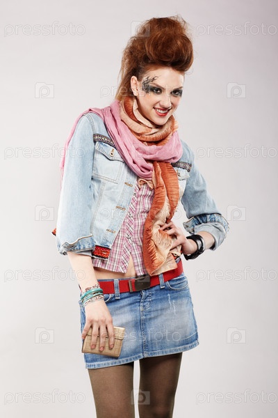 Портрет рыжей девушки-панка на сером фоне