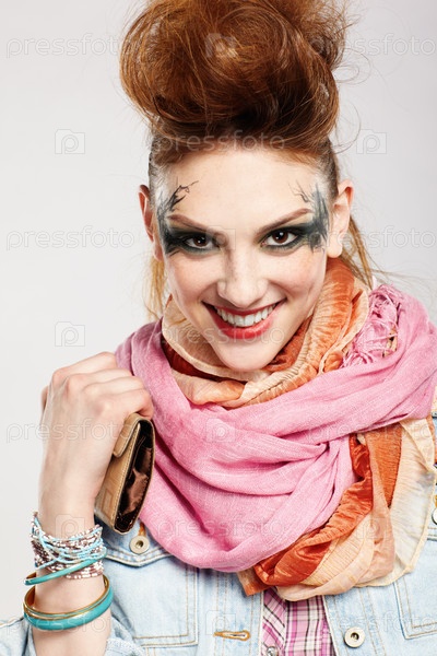 Портрет рыжей девушки-панка на сером фоне