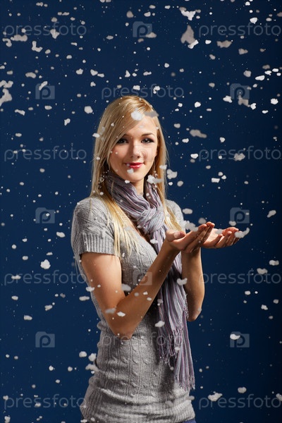 Красивая блондинка ловит падающие снежинки