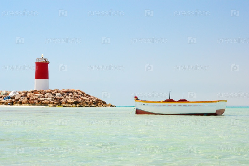 Морской пейзаж с лодкой и маяком