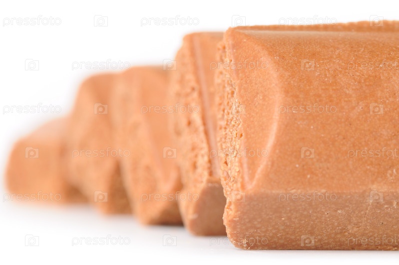 Ряд кусочков шоколада изолирован на белом фоне