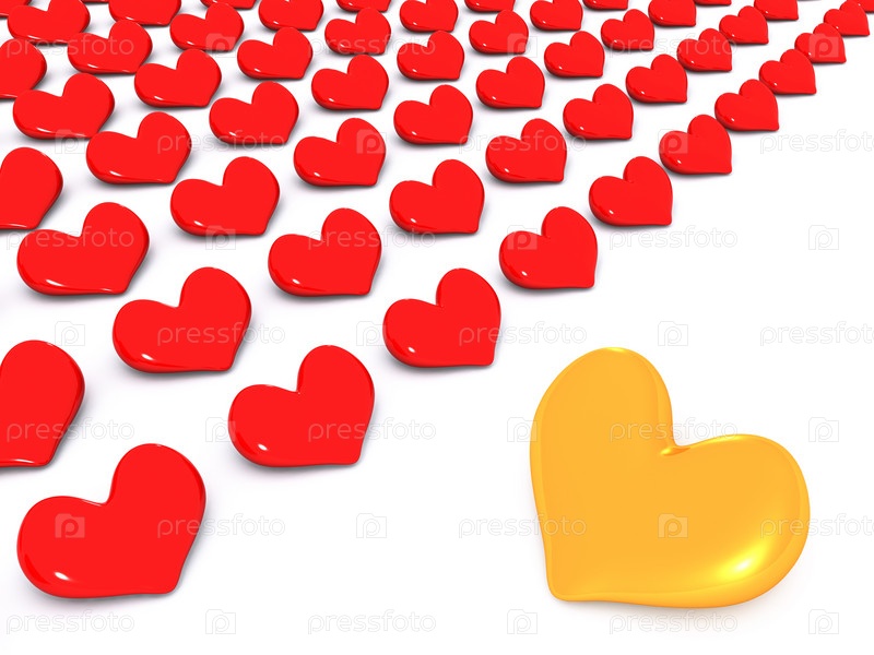 Одно золотое и много красных сердечек на белом фоне. 3D