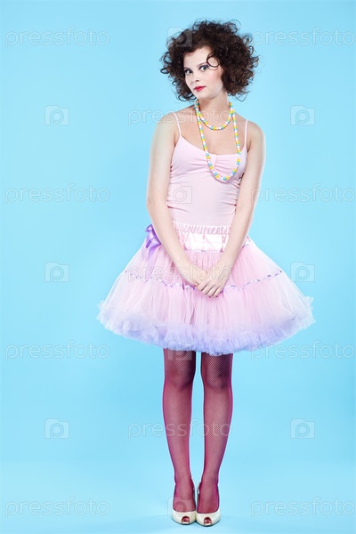 Брюнетка с кудрявыми волосами на голубом фоне