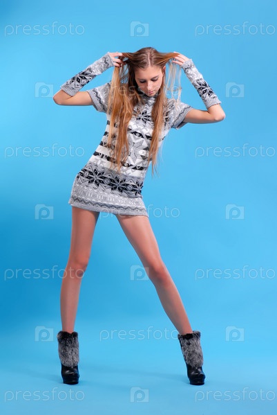 Молодая девушка в красивом трикотажном платье с узором и перчатках без пальцев