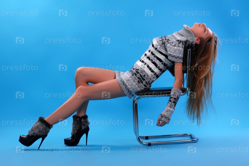 Молодая девушка в красивом трикотажном платье с узором и перчатках без пальцев