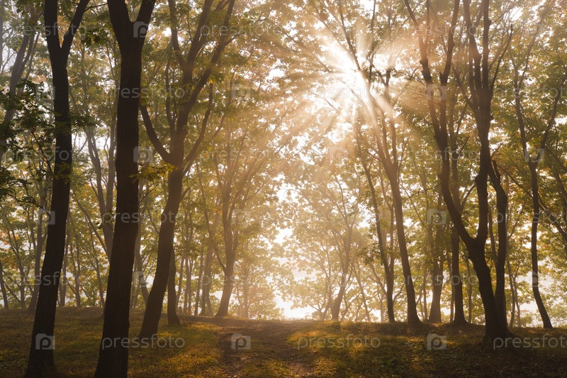 Лучи солнца пробиваются сквозь стволы деревьев в лесу