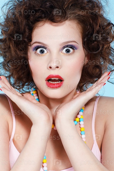 Удивленная брюнетка с кудрявыми волосами на голубом фоне
