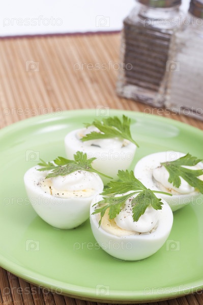 Вареные яйца с майонезом и зеленью петрушки на тарелке