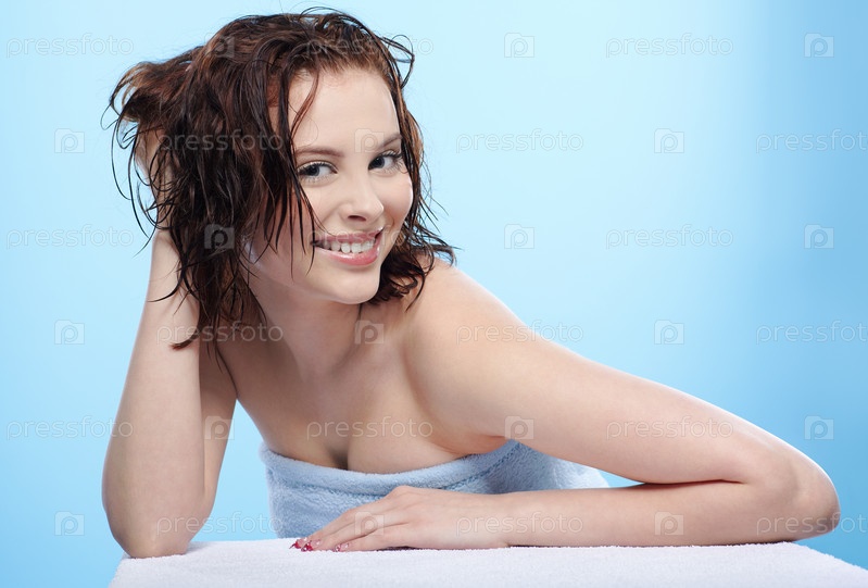 Брюнетка в полотенце с мокрыми волосами на голубом фоне