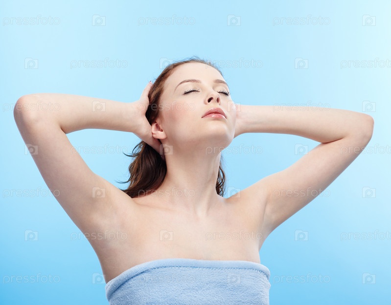Брюнетка в полотенце с мокрыми волосами на голубом фоне