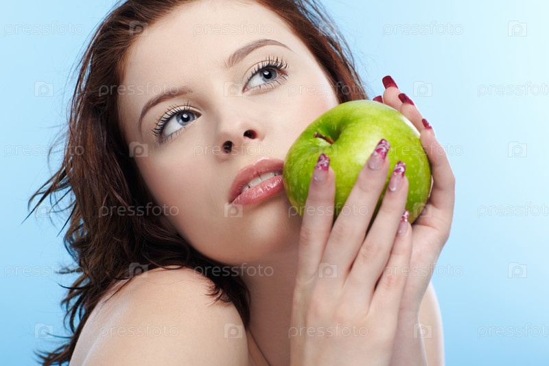 Портрет брюнетки с зеленым яблоком на голубом фоне