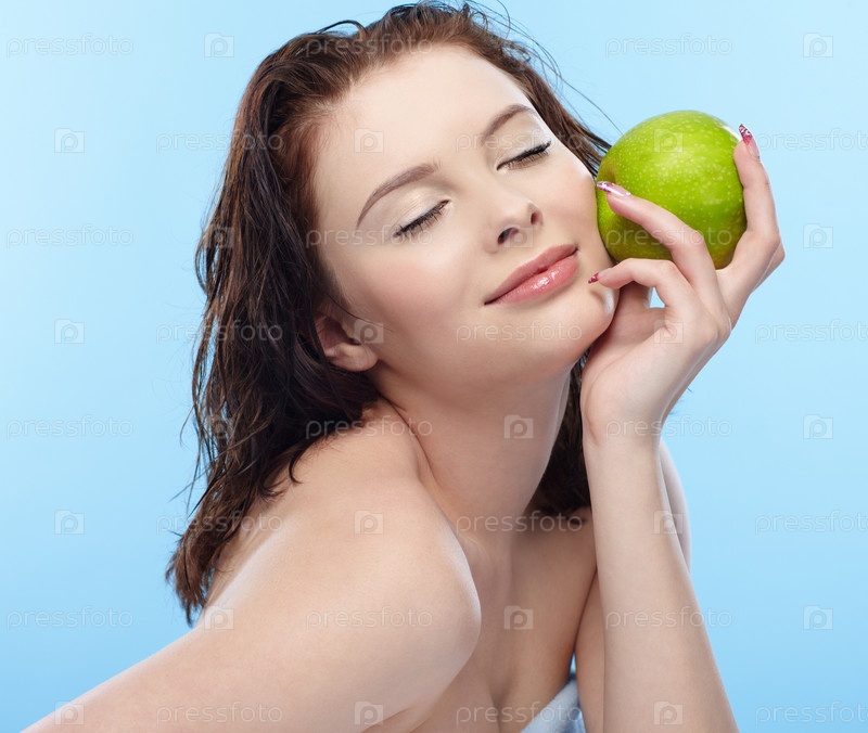 Расслабленная брюнетка с зеленым яблоком на голубом фоне