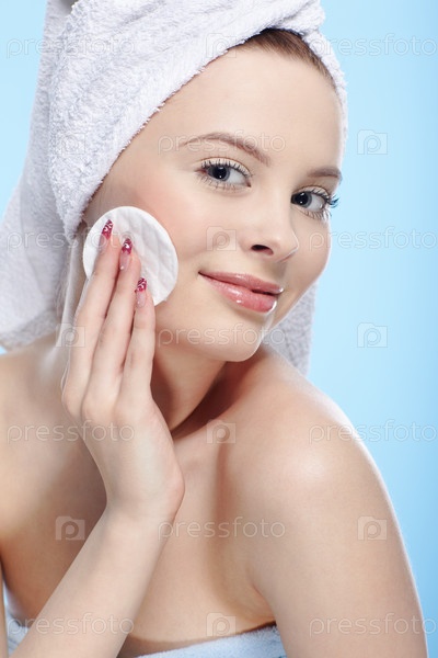 Девушка в полотенце с ватным тампоном на голубом фоне