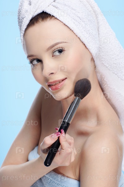 Девушка в полотенце с кисточкой для румян на голубом фоне