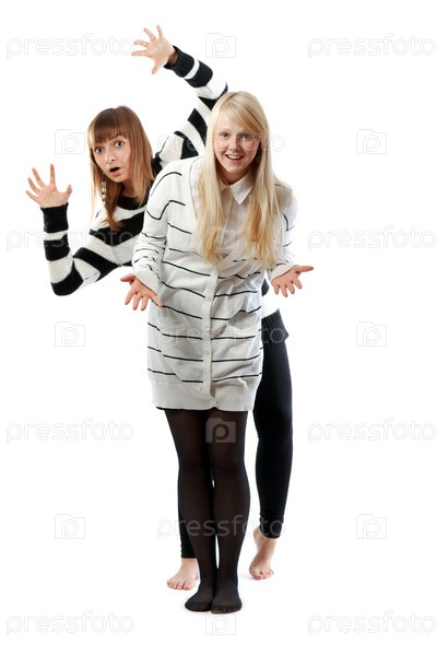 Две девушки валяют дурака на белом фоне