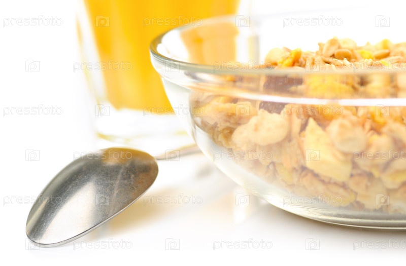 Мюсли, ложка и сок на белом фоне