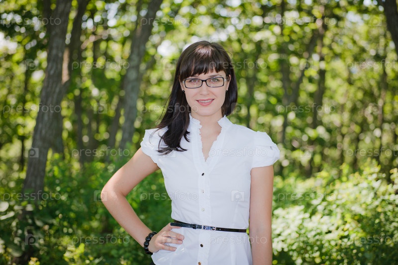 Девушка в белой офисной блузке на фоне природы