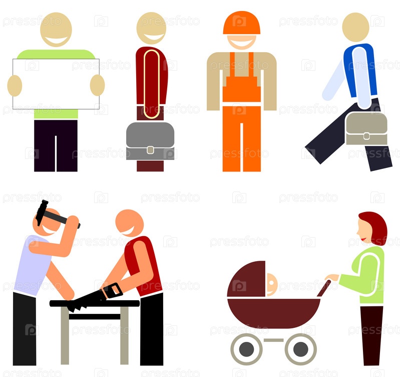 Набор цветных векторных икон - людей различных профессий или занятий. Стилизованные цветовые иллюстрации, элементы дизайна. Многоцветовая пиктограмма на белом фоне
