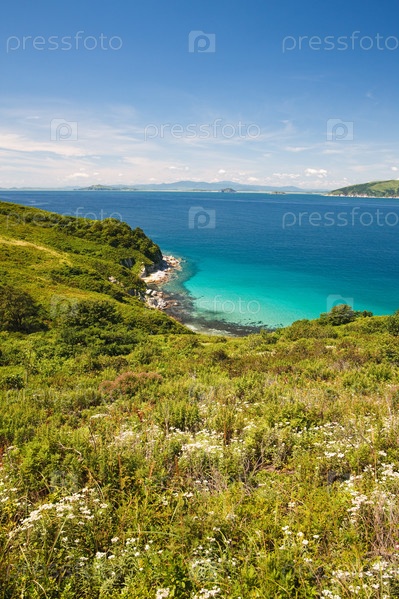 Горное травянистое побережье Японского моря на фоне синего облачного неба