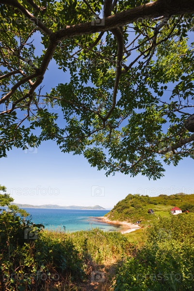 Изумрудный лес у горного побережья Японского моря на фоне голубого неба