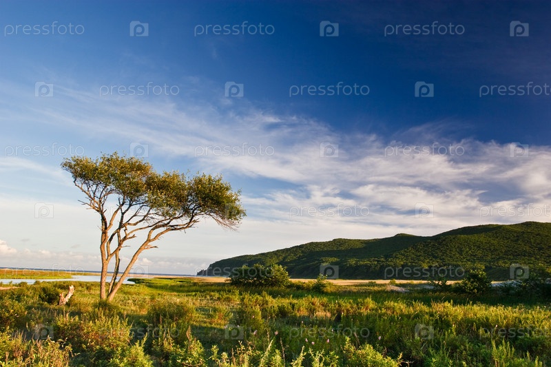Одинокое дерево и часть холма на фоне голубого облачного неба