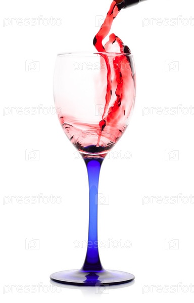 Красное вино льется в бокал, изолированный на белом фоне