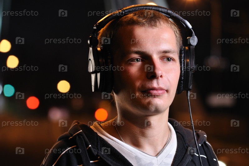Молодой мужчина в наушниках, идущий по ночному городу