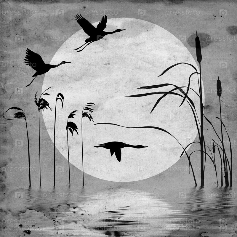 Иллюстрация птиц на фоне луны