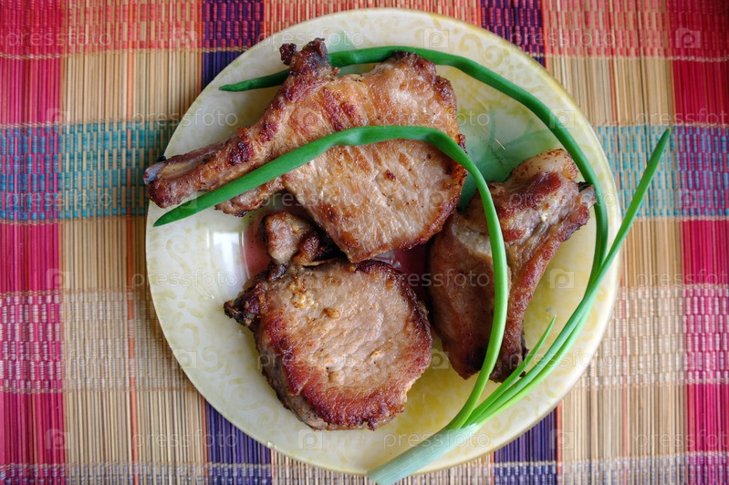 Жареное мясо с зеленым луком на тарелке