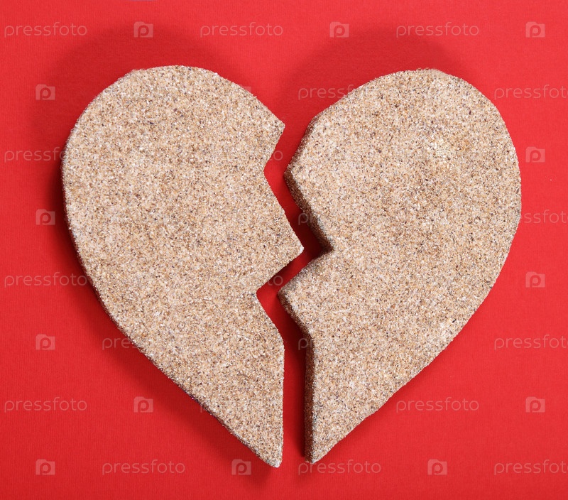 Разбитое сердце из песка на красном фоне
