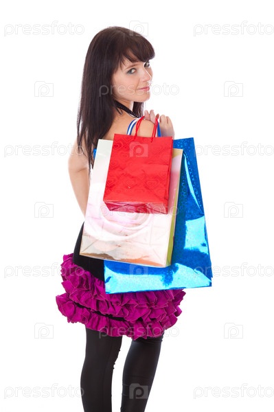 Улыбающаяся девушка с яркими бумажными пакетами. Изолирована на белом фоне