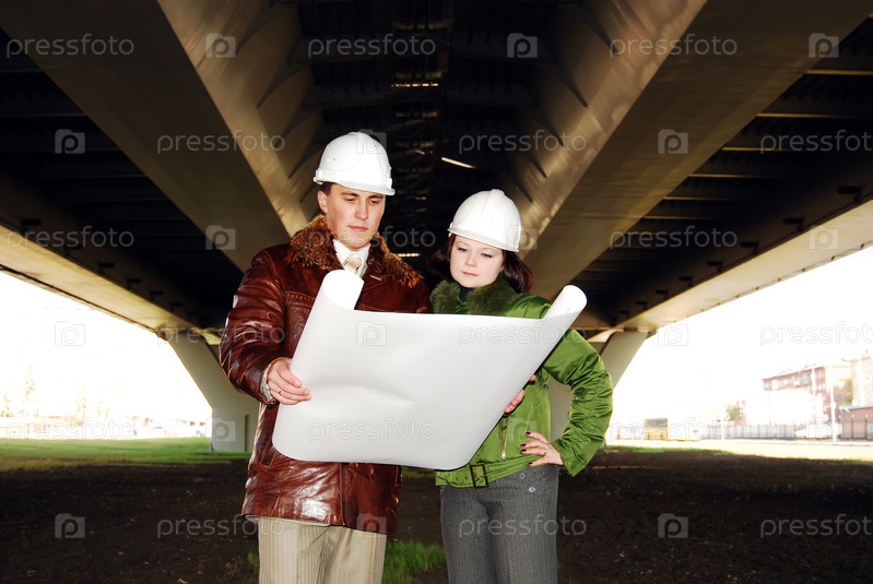 Мужчина и женщина в защитных касках рассматривают схему строительства