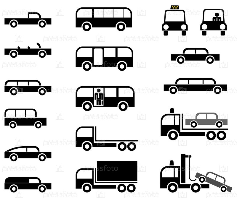Различные типы кузова автомобилей - стилизованные векторные пиктограммы. автомобили, грузовики, буксиры и автобусы