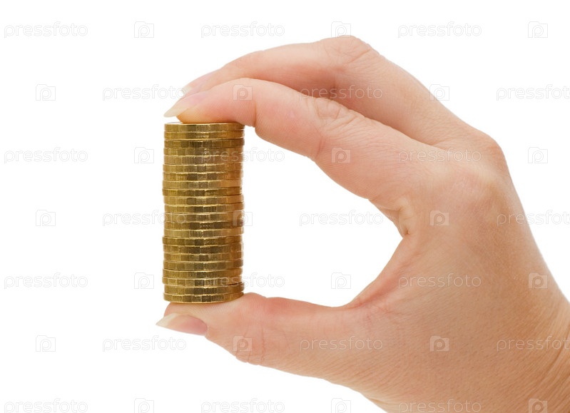 Стопка монет в руке на белом фоне