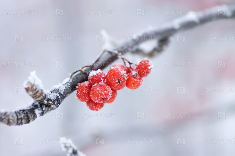 Замерзшие ягоды рябины на ветке