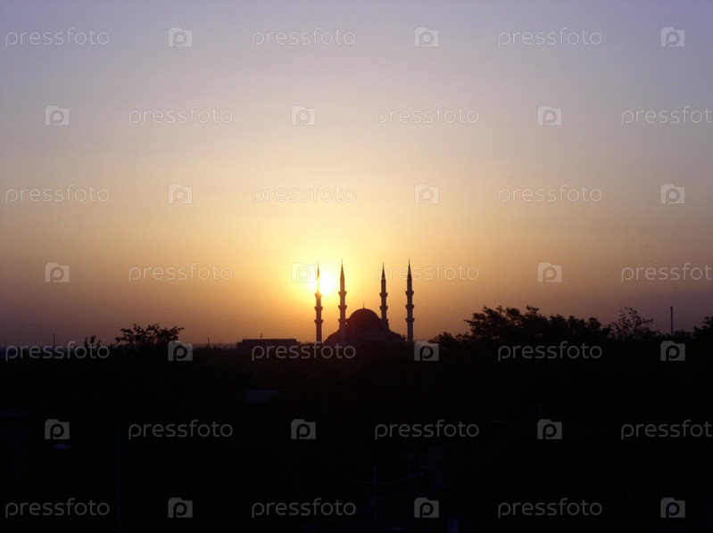 Солнце встает над минаретами мечети в Ашгабаде