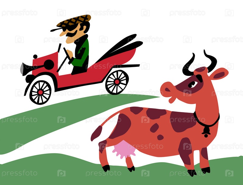Мужчина едет на машине мимо коровы на лугу