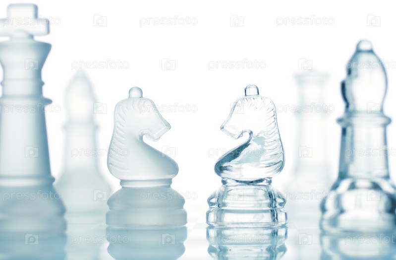 Прозрачные стеклянные шахматы, изолированные на белом фоне