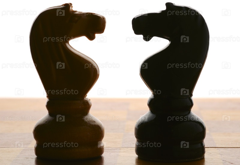 Темные силуэты двух шахматных коней на белом фоне