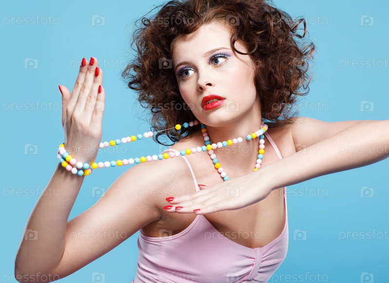 Портрет красивой брюнетки на голубом фоне