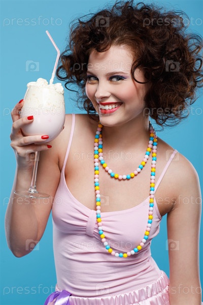 Красивая брюнетка держит стакан коктейля