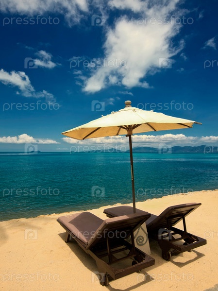 Зонтик и два шезлонга на пляже