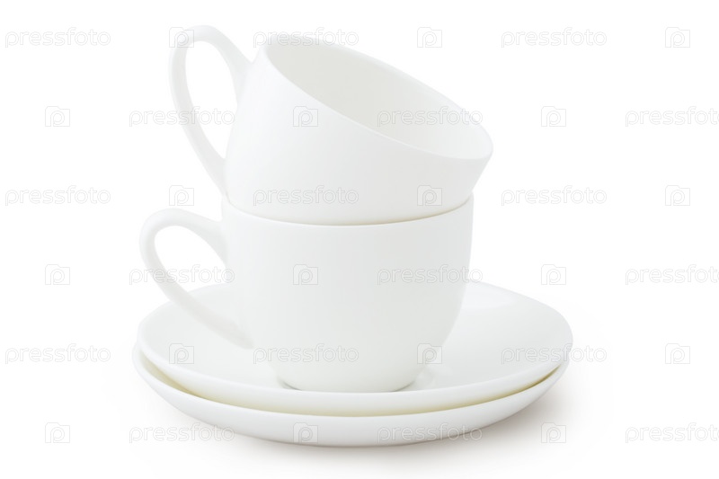Две белые чашки с блюдцами, изолированные на белом фоне