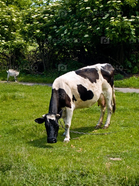 Корова пасется на зеленом лугу