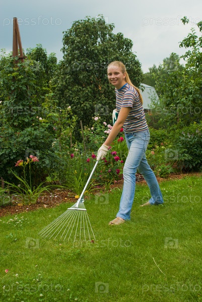 Девочка расчесывает газон веерными граблями