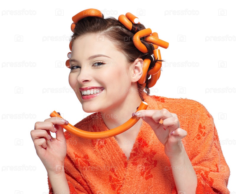 Девушка в оранжевом халате и бигудях на белом фоне