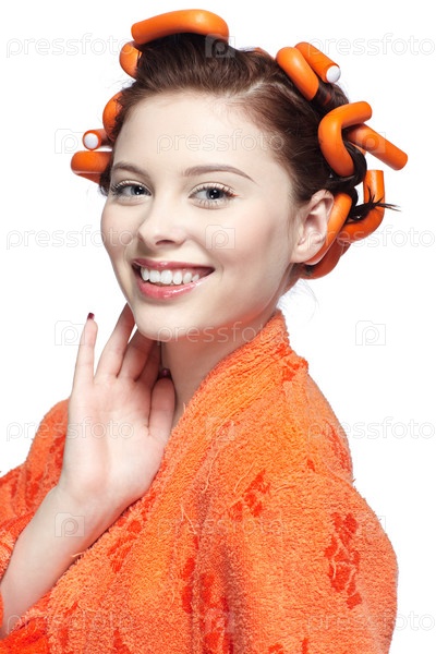 Девушка в оранжевом халате и бигудях на белом фоне