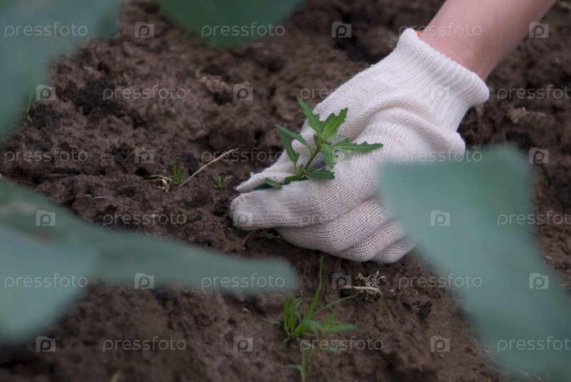 Рука человека в белой перчатке чистит грядку от сорняков