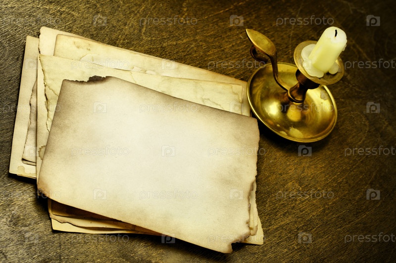 Стопка старых листов бумаги и свеча на деревянном столе